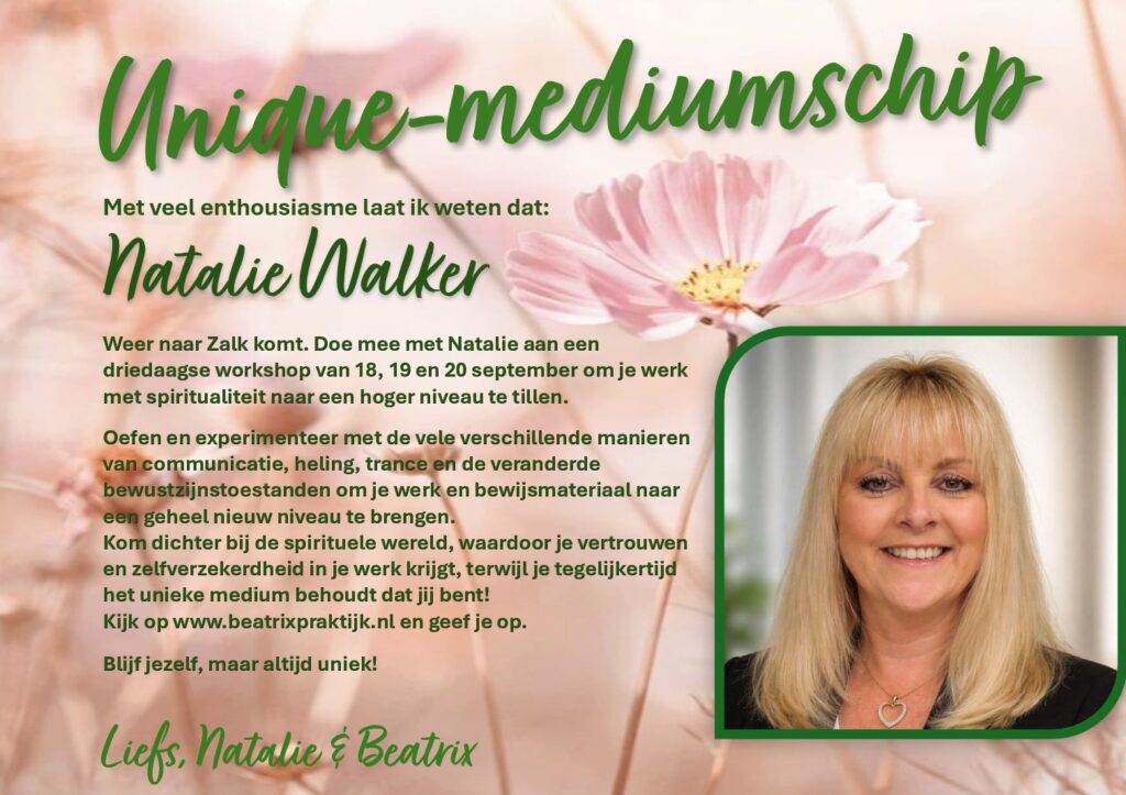 Met heel veel enthousiasme delen wij dat Natalie Walker opnieuw naar Zalk komt! Van 18, 19 en 20 september verzorgt zij een inspirerende driedaagse workshop voor iedereen die zijn of haar werk met spiritualiteit wil verdiepen, versterken en verfijnen.