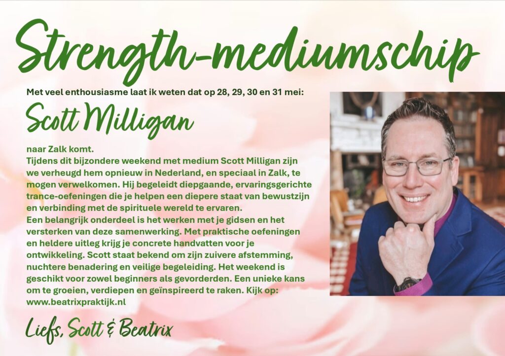 Voor dit bijzondere lange weekend met medium Scott Millagan staat er iets unieks te gebeuren. We zijn dan ook ontzettend blij dat hij opnieuw naar Nederland komt – en speciaal naar Zalk. Zijn komst voelt als een voorrecht en we kijken er enorm naar uit om samen deze inspirerende dagen te beleven.